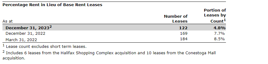 Included in the leasing activity for the quarter were 39 new leases that were for a lease term of less than one year, or for percentage rent in lieu of base rent. While these lease structures have always been a tool to manage tenant relocations and the timing of development plans, during the pandemic, leases structured as percentage rent in lieu of base rent were more prevalent to assist tenants and to maintain occupancy rates. As these leases mature, management anticipates moving tenants back to traditional lease structures. At Dec. 31, 2023, percentage rent in lieu of base rent leases were in place for 600,000 square feet of GLA, or 4.8 per cent as a percentage of in-place leases with an average remaining lease term of 2.1 years.