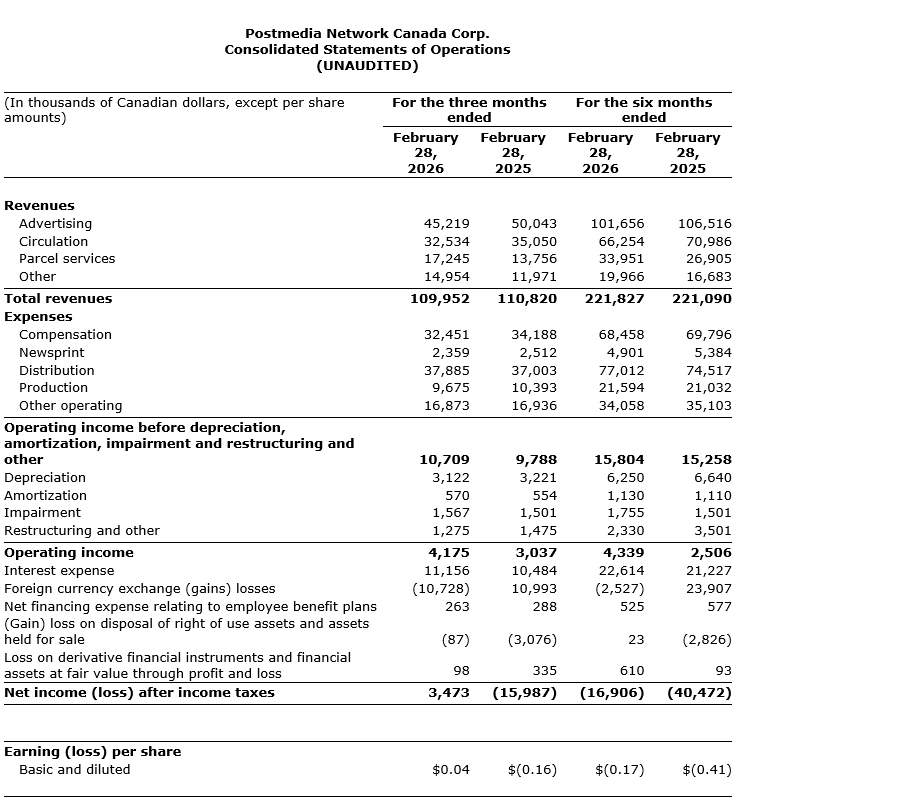 Postmedia Network Canada Corp. today released financial information for the three and six months ended Feb. 28, 2026.