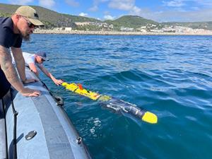 Figure 3: Royal Netherlands Navy REMUS 100 with Kraken MP-SAS heading out on a Search-Classify-Map (SCM) mission at REPMUS 23.