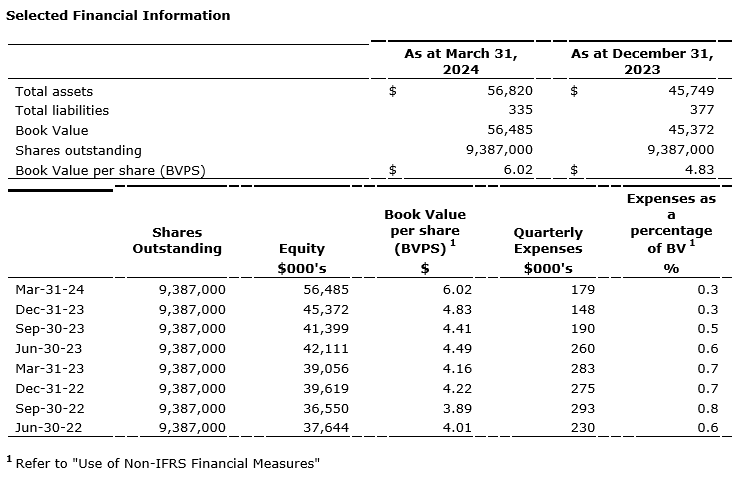 Expenses for the 12 months ended March 31, 2024, were $777, which correspond to 1.4 per cent of book value as at March 31, 2024. This compares with expenses of $1,081 for the 12 months ended March 31, 2023, which corresponds to 2.8 per cent of book value as at March 31, 2023. Since expenses fluctuate from quarter to quarter, management monitors costs on a trailing 12-month basis.