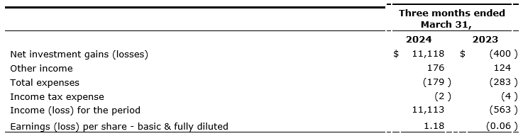 The net investment gains for the three months ended March 31, 2024, were $11,118 (three months ended March 31, 2023: net investment losses of $400) as a result of net realized gains on investments and the net change in unrealized gains.