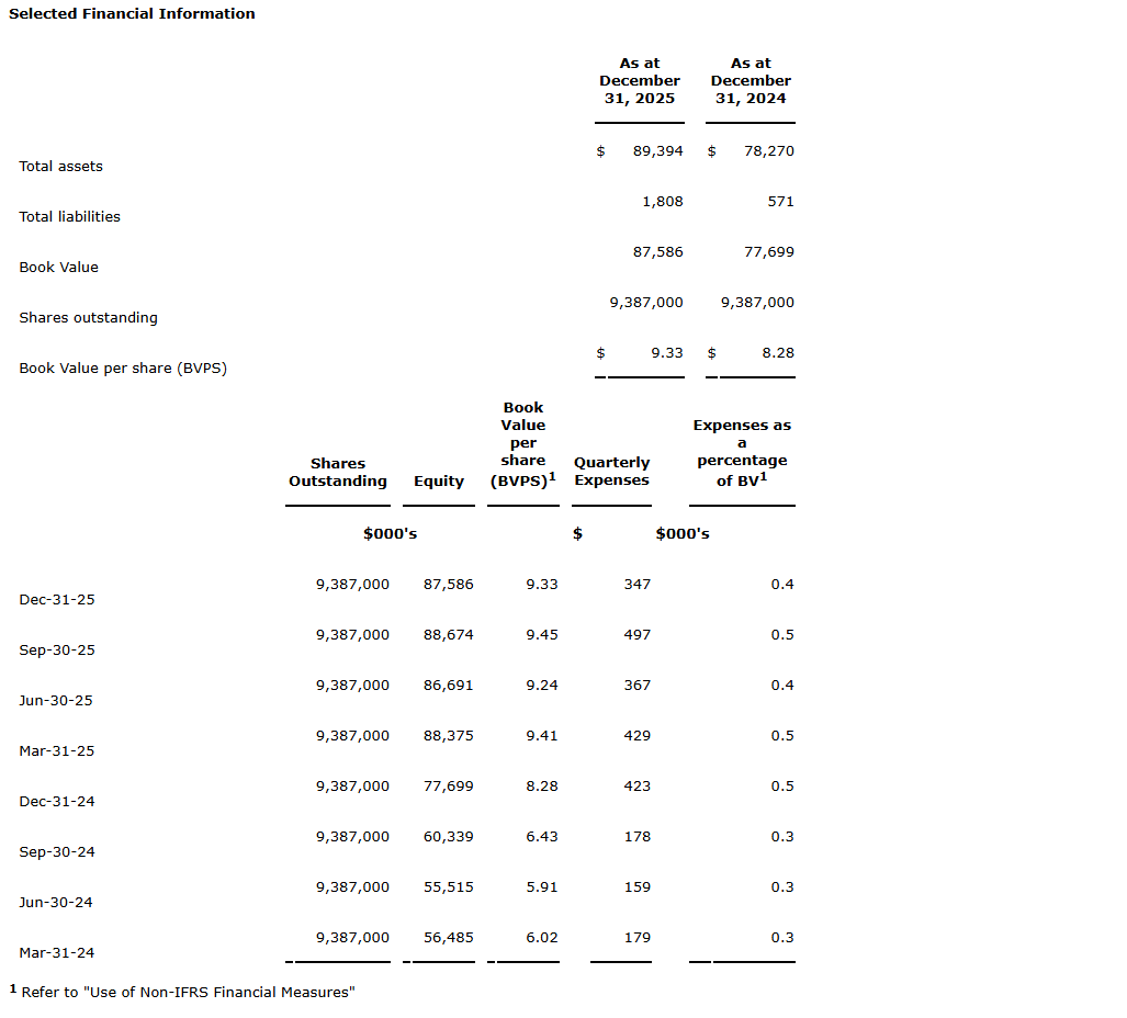 Expenses for the 12 months ended Dec. 31, 2025, were $1,640 which corresponds to 1.9 per cent of equity as at Dec. 31, 2025. This compares with expenses of $939 for the 12 months ended Dec. 31, 2024, which corresponds to 1.2 per cent of equity as at Dec. 31, 2024. Included in expenses are foreign exchange fluctuations resulting from cash balances held in currencies other than Canadian dollars.