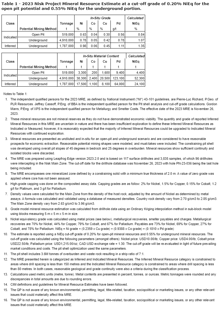"Our inaugural NI 43-101 technical report is an excellent start and major first step to showing the significant commercial potential of Nisk. We believe this mineral resource estimate establishes us as one of the world's best nickel investment opportunities. Power Nickel took a particularly robust approach for this mineral resource estimate by involving independent experts in data management, metallurgy, mining engineering and mineral resource estimation. If compared to our peers, we may have pushed this study further than what we had to at this stage, but we believe that there is no ambiguity about the results obtained and that this study fully supports the coming stages," stated Power Nickel chief executive officer Terry Lynch.
