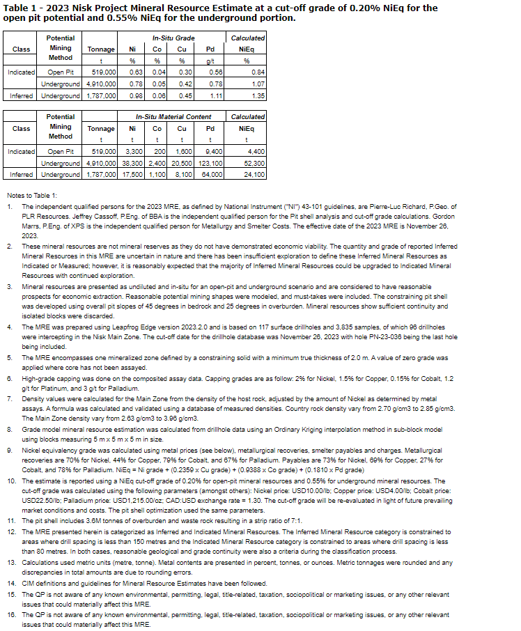 The amended technical report is dated effective Jan. 19, 2024, with an issue date of Jan. 19, 2024, and is titled "Amended and Updated NI 43-101 Technical Report and Updated Mineral Resource Estimate for the Nisk Project, Eeyou Istchee James Bay Territory, Quebec." The amended technical report was prepared for the company by Duncan Studd, PGeo, MSc, of GeoVector Management Inc., Pierre Luc Richard, PGeo, MSc, of PLR Resources Inc., Gordon Marrs, PEng, of XPS (Expert Process Solutions), and Jeffrey Cassoff, PEng, of BBA Inc.