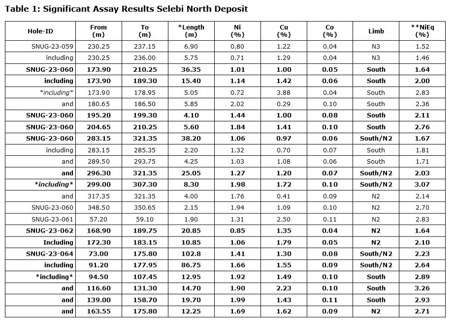 - SNUG-23-064 (South Limb/N2): 102.80 metres of 2.23% NiEq (1.41% Ni; 1.30% Cu; 0.08% Co)