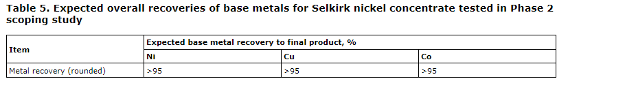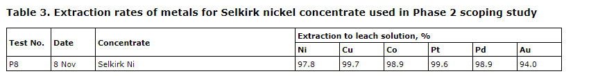 Phase 2 extraction from solution focused on the Selkirk nickel concentrate. A larger volume of Selkirk nickel concentrate was tested in a 20-litre autoclave giving extractions rate shown in the next attached table.