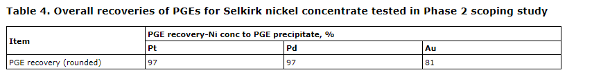 Chris Fleming, SGS Canada, commented: "Recoveries of all the pay metals (Ni, Cu, Co, Au, Pt and Pd) to the solution phase were very high (generally greater than 99 per cent) in the initial batch autoclave testing of the Platsol process with concentrates from both the Selkirk and Selebi projects. In fact, in all my years of testing the Platsol process on ores and concentrates from around the world, I have never before experienced Pt and Pd recoveries of greater than 99 per cent by direct autoclave leaching under Platsol conditions. The downstream processes have been tested at bench scale and separate precious metal, copper, cobalt and nickel products have been generated -- targeting a final nickel product of battery-grade nickel sulphate hexahydrate. Although it is not possible to precisely quantify final metal recoveries to saleable products until continuous, integrated piloting is completed, based on commercial experience of base metal hydrometallurgical plants, overall recoveries of all pay metals from both Selkirk and Selebi nickel and copper concentrates or a combined bulk nickel-copper (plus Co, PGEs) concentrate should be greater than 95 per cent in a well-designed, well-operated plant. SGS Minerals looks forward to working with PNRL to advance this project to a prefeasibility stage."
