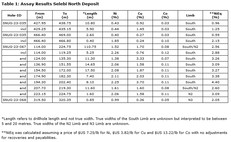 - SNUG-23-067 (South Limb/N2): 110.75 metres of 2.56 per cent NiEq (1.52 per cent Ni; 1.70 per cent Cu; 0.08 per cent Co)