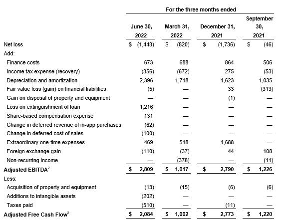 Consolidated adjusted earnings before interest, taxes, depreciation and amortization is a non-IFRS measure of financial performance. Company management defines adjusted EBITDA as IFRS net income (loss) adding back finance costs, income taxes, depreciation, amortization, gain/loss on disposal of assets and extinguishment of loans, fair value gain/loss on financial liabilities, and contingent consideration, and excludes discontinued operations, and the effects of significant items of income and expenditure, which may have an impact on the quality of earnings, such as impairments where the impairment is the result of an isolated, non-recurring event. It also excludes the effects of equity-settled share-based payments, foreign exchange gains/losses, changes in deferred revenues, changes in deferred cost of sales and other extraordinary one-time expenses, such as transaction costs, and other severance and restructuring costs. See a reconciliation of adjusted EBITDA in an attached table.