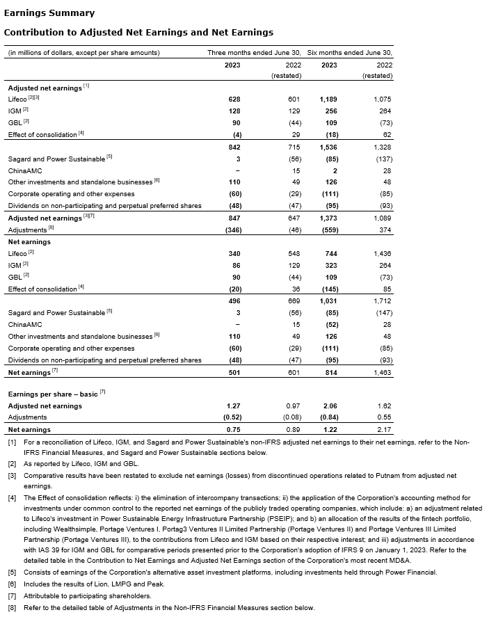 The information below is derived from Lifeco and IGM's second quarter MD&As (management's discussion and analysis documents), as prepared and disclosed by the respective companies in accordance with applicable securities legislation, and which are also available either directly from SEDAR+ or from the websites of the respective companies. The information below related to GBL is derived from publicly disclosed information, as issued by GBL in its half-year report at June 30, 2023. Further information on GBL's results is available on its website.