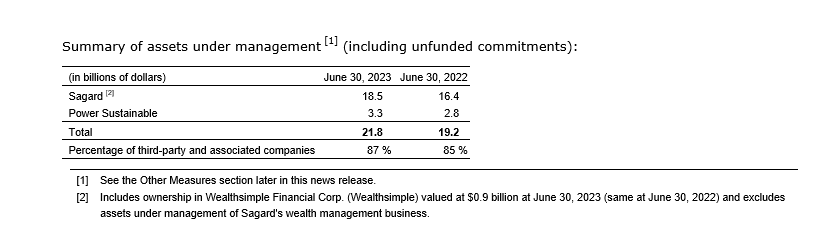 - Assets under management and advisement, including strategic investments, were $402.8-billion as at June 30, 2023, compared with $376.5-billion at March 31, 2023, and $305.0-billion at June 30, 2022.