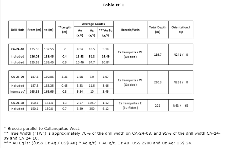 John Thomas, chief executive officer, commented: "The results of CA-24-08 confirm continuity of the Callanquitas East breccia at an elevation of 2,830 m, well below the present mining area, and with economic grades of Au and Ag within mixed oxides and sulphides. Additionally, the drill holes CA-24-09 and CA-24-10 that intercepted Callanquitas West are located in a new area, with no historical drilling. Both holes confirm the continuation of the gold mineralization as expected from the surface sampling. The distance between the intersections is 350 metres and does indicate the need for more drilling to confirm this strike length and continuity.