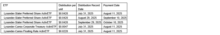 LYSANDER ANNOUNCES CASH DISTRIBUTIONS FOR THE LYSANDER ACTIVETFS