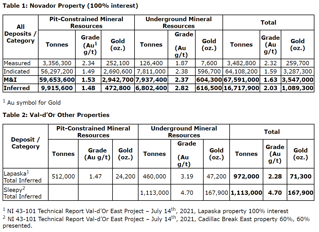 - Novador project gold mineral resources, slated for development, currently stand at 3,793,900 ounces M&I and 1,179,400 ounces inferred along the Monique, Pascalis and Courvan gold trends deposits, representing a 30-per-cent increase from the 2021 mineral resource estimate;