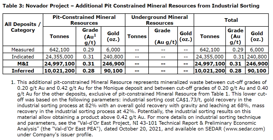This additional pit-constrained mineral resource represents mineralized waste between cut-off grades of 0.20 gram per tonne gold and 0.42 gram per tonne gold for the Monique deposit and between cut-off grades of 0.20 gram per tonne gold and 0.40 gram per tonne gold for the other deposits, exclusive of pit-constrained mineral resource. This lower cut-off was based on the following parameters: industrial sorting cost $1.73 per tonne, gold recovery in the industrial sorting process at 82 per cent with an overall gold recovery with gravity and leaching at 68 per cent, mass recovery in the industrial sorting process at 42 per cent. Potentially, the industrial sorting results on this material allow obtaining a product above 0.42 gram per tonne gold. For more details on industrial sorting technique and parameters, see the "Val d'Or East Project, NI 43-101 Technical Report & Preliminary Economic Analysis," dated Oct. 20, 2021, and available on SEDAR under company's issuer profile.