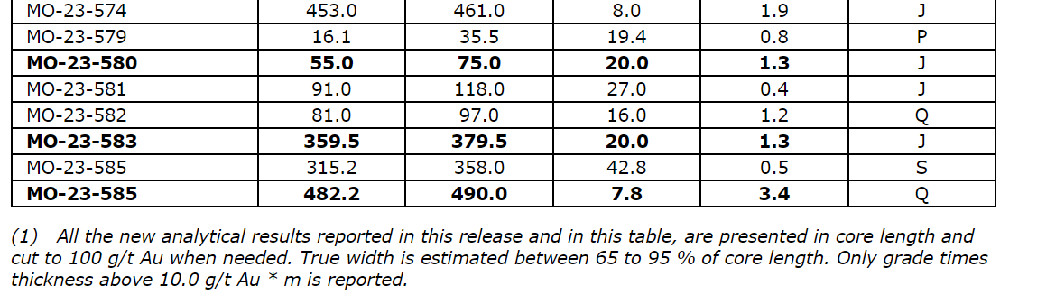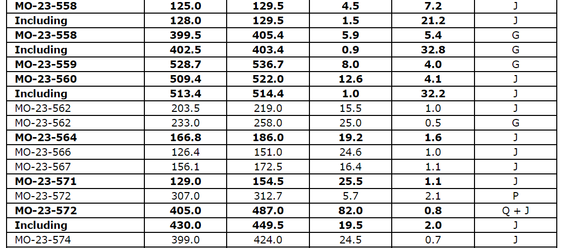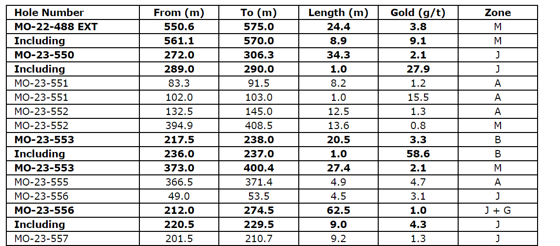 Selected drill results from the 2023 Monique deposit drilling program are provided in an attached table.