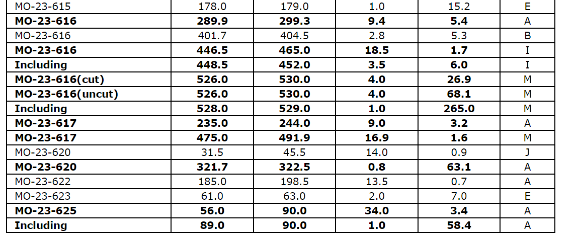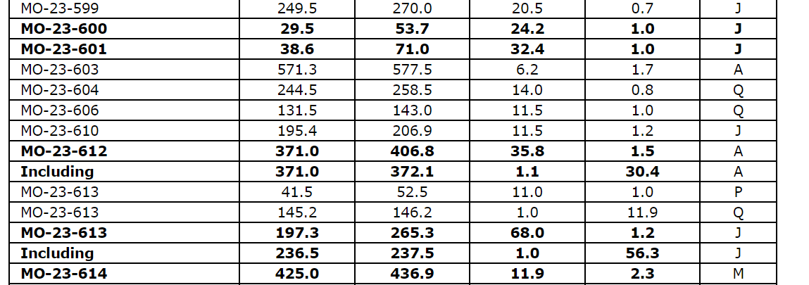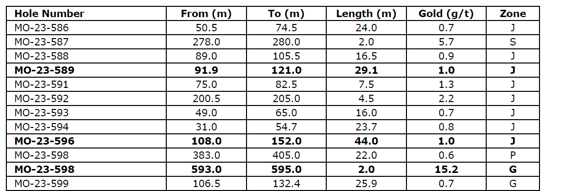 Selected drill results from the 2023 Monique deposit drilling program are provided in an attached table.