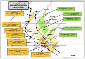 o including 81 m @ 3.17 g/t Au, 2.12 g/t Ag, 0.07% Cu from 342 m