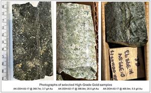 High-grade core samples taken from three different 3-meter sections from historical hole AK-DDH-02-17.