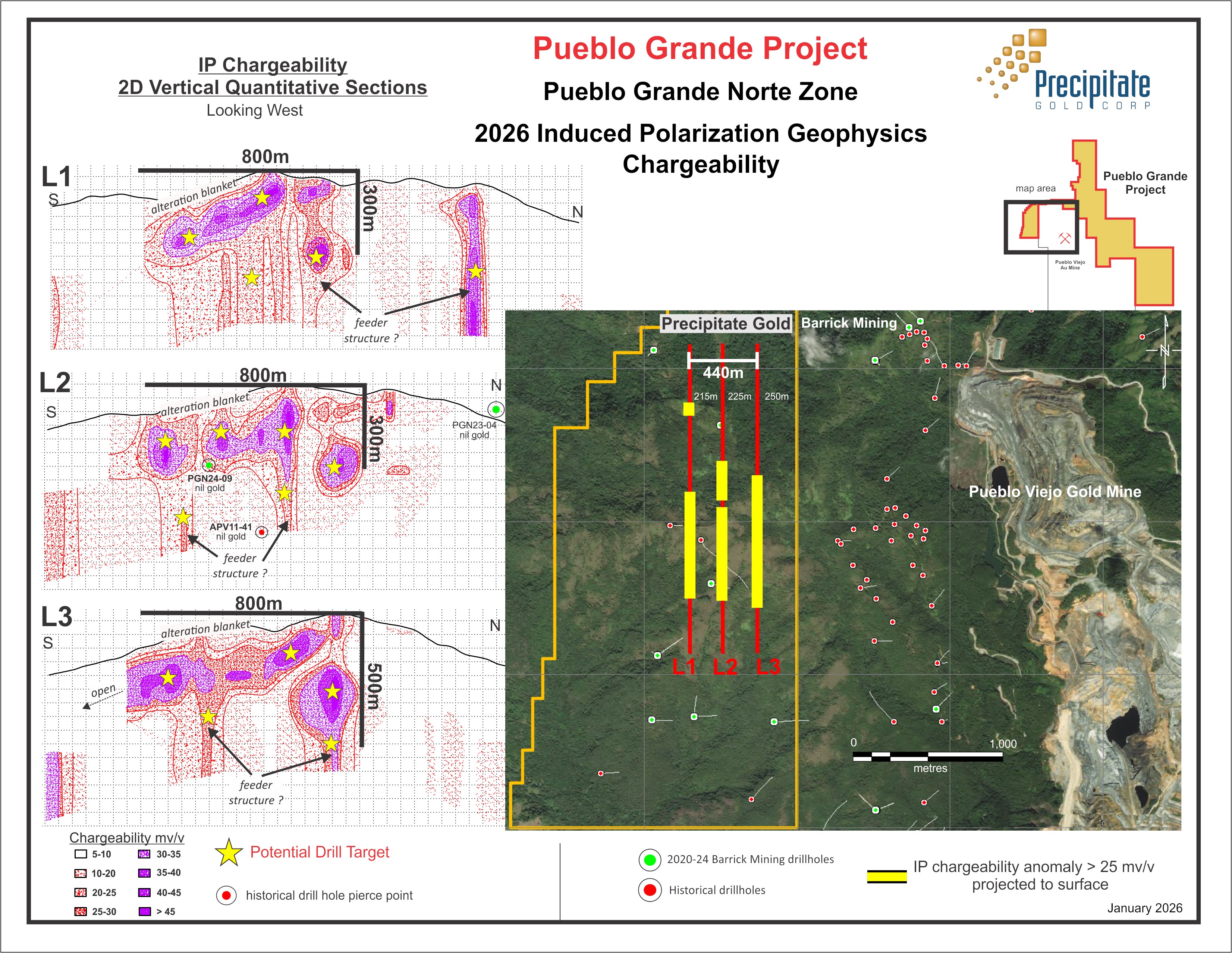 The drill campaign is budgeted to consist of an initial four holes, each with an estimated average drill depth of approximately 450 metres for a total expected program of approximately 2,000 metres. The drill campaign is designed to test a newly identified cluster of induced polarization ("IP") geophysical chargeability-high anomalies that were recently delineated through a comprehensive review of historical exploration data and follow-up IP geophysical surveying completed by Precipitate late last year (see news release dated January 22, 2026). See figures and photographs below.