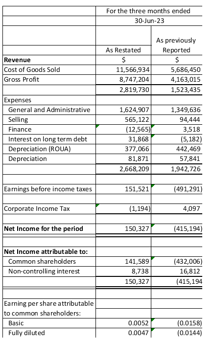 The presentation currency for the financial statements of Pearl River is the Chinese yuan renminbi, and the financial statements also include certain applicable Canadian-dollar conversion amounts. Following the filing of the financial statements for the interim period ended June 30, 2023, management of Pearl River discovered that the column on the condensed interim consolidated statement of operations showing the Canadian-dollar-equivalent amount for the three months ended June 30, 2023, had not been updated from the 2022 amounts. For clarity, all of the amounts in Chinese yuan renminbi were correct.