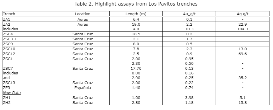 The company also announced assay results for the last four trenches from its recently completed trenching program (see news release of July 21, 2023). Two samples from the Santa Cruz area yielded 3.98 grams per tonne and 1.18 g/t gold (Au) over one metre and 2.7 m, respectively, as shown in the table entitled "Highlight assays from Los Pavitos trenches."