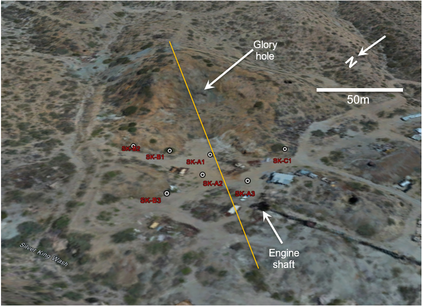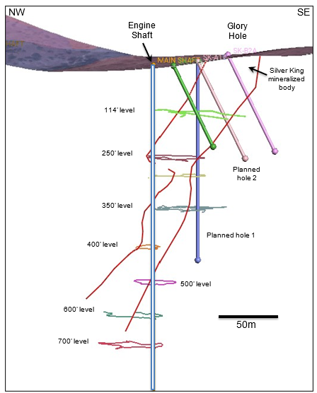 The approved permit authorizes drilling from multiple drill pads in the area of the historic mine designed to test the upper part of the Silver King mineralized body that was mined on nine levels over about 300 meters depth (Fig. 1).