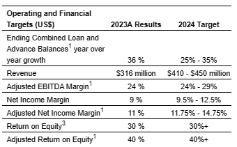 Propel finished fiscal year 2023 with record results across multiple operating and financial metrics and with a strong financial position to support its growth. The 2024 targets below are supported by our strategy which includes: i) scaling of our core business in the US and Canada; ii) expansion of our Lending-as-a-Service offering; and iii) investment in our proprietary technology to maintain our market leadership in AI-powered lending.