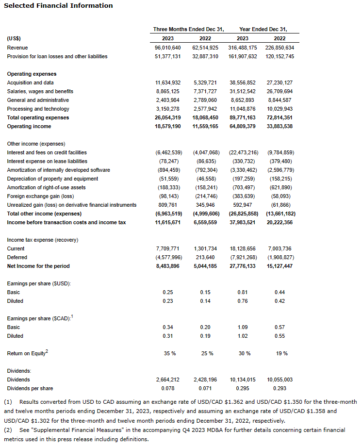 Propel Holdings Inc. has released another set of record financial results for the three months and fiscal year ended Dec. 31, 2023. All amounts are expressed in U.S. dollars unless otherwise stated.
