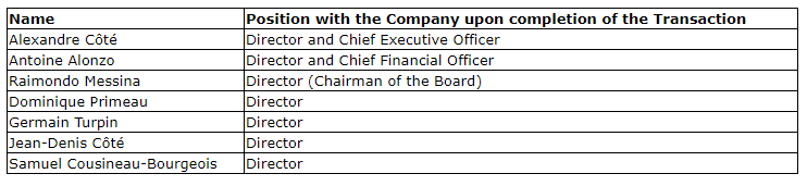 The board of directors of the company presently is made up of six members. Pursuant to the share purchase agreement, two present directors of the company shall resign and the board shall be reconstituted to include Jean-Denis Cote, Antoine Alonzo and Samuel Cousineau-Bourgeois as nominees of 9296. The names of the intended directors and officers of the company following completion of the transaction and their respective positions with the company are as set forth in the attached table.