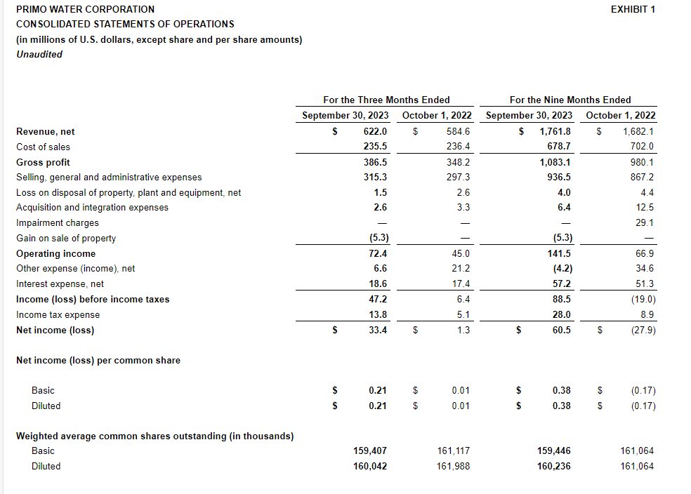 Primo Water Corp. has released its results for the third quarter ended Sept. 30, 2023.