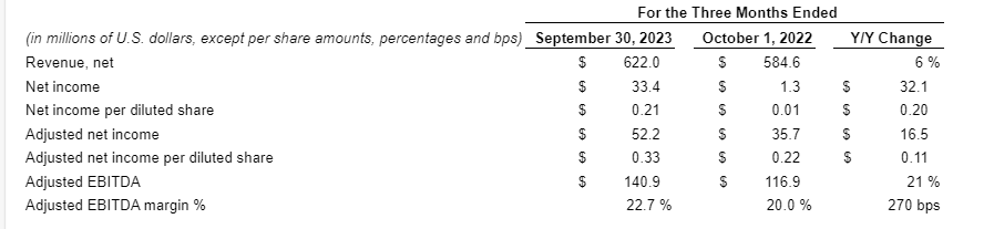 "Our third quarter performance gives us confidence to reaffirm our 2023 outlook to between $2.32-billion and $2.36-billion of revenue and adjusted EBITDA to between $460-million and $480-million. Full-year 2023 adjusted free cash flow is now forecasted to increase to approximately $160-million, an increase of $10-million versus our previous guidance," said Mr. Harrington.