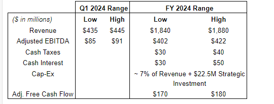 Mr. Rietbroek continued: "Given the strength of our businesses, we expect our first quarter 2024 outlook from continuing operations for revenue to be between $435-million and $445-million and adjusted EBITDA to be between $85-million and $91-million. Full-year 2024 outlook from continuing operations for revenue is forecasted to be between $1.84-billion and $1.88-billion and adjusted EBITDA to be between $402-million and $422-million. Full-year 2024 adjusted free cash flow from continuing operations is forecasted to be between $170-million and $180-million. These forecasts reflect the successful execution of the previously announced transaction to sell a significant portion of our international businesses. We intend to use the gross proceeds of $575-million from the sale to pursue growth, both organically and through tuck-in M&A, reduce leverage, and return capital to shareholders via share repurchases and dividends. As we move through 2024, we will sell the remainder of the international businesses, further improving our balance sheet and North American focus as we execute our vision and effectively deploy capital.