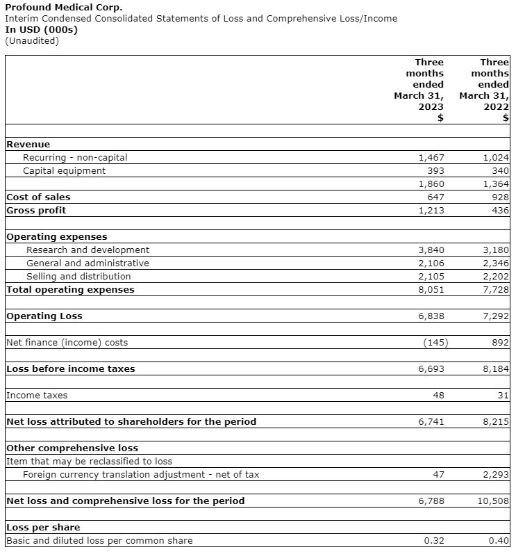 For complete financial results, please see Profound's filings at www.sedar.com, www.sec.gov and on the Company's website at www.profoundmedical.com under "Financial" in the Investors section.