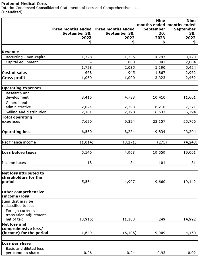PROFOUND MEDICAL ANNOUNCES THIRD QUARTER 2023 FINANCIAL RESULTS