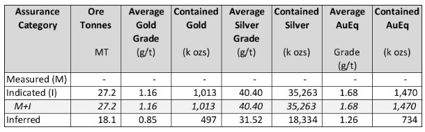 - 3.25 g/t AuEq (1.25 g/t Au and 154.7 g/t Ag) over 1.6-metre etw.