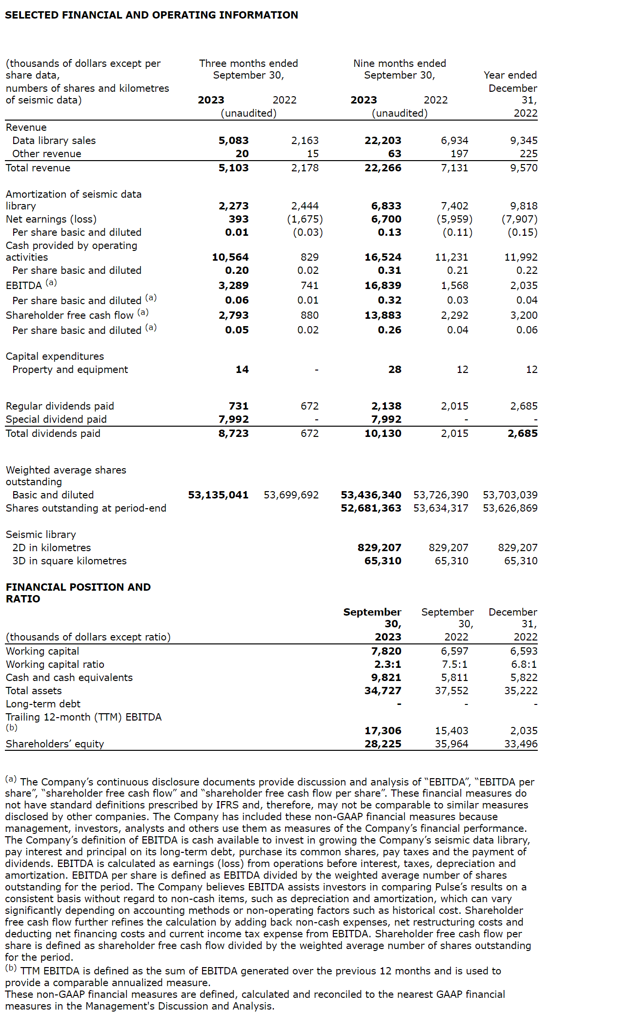 PULSE SEISMIC INC. REPORTS THIRD QUARTER 2023 RESULTS AND DECLARES REGULAR QUARTERLY DIVIDEND