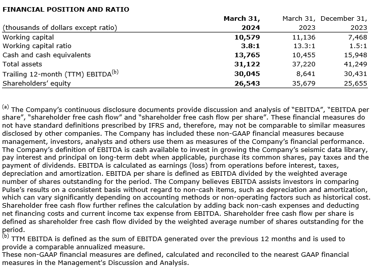 Pulse Seismic Inc. has released its financial and operating results for the three months ended March 31, 2024. The unaudited condensed consolidated interim financial statements, accompanying notes, and management's discussion and analysis (MD&A) are being filed on SEDAR+ and will be available on Pulse's website.
