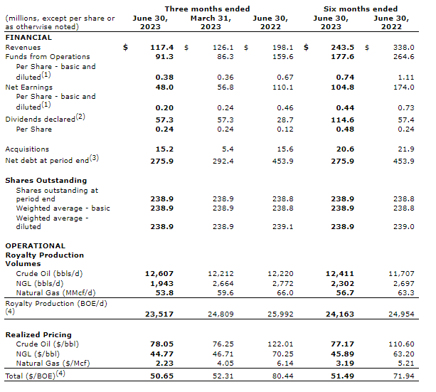 "It has been a strong first half of 2023 with organic growth in oil royalty production, leasing activity at multiyear highs, and drilling activity across a diversity of plays and targets in our expansive portfolio. We would like to thank our staff for their hard work and shareholders for their support," said Andrew Phillips, president and chief executive officer.