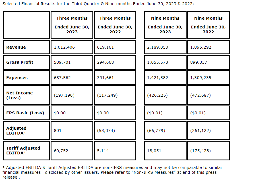 Expenses during the nine-month period increased to $1,421,582 versus $1,309,237 a year ago, an increase of 8.6 per cent. Year to date, administration expenses in the amount of $202,126 incurred in previous periods were reversed resulting in reduced expenses during the period. However, this was offset by increased foreign exchange losses of $30,449 in the current year versus a gain of $86,326 in the same period a year earlier. This was also offset by $162,169 of rent and wage subsidies received in the nine months ended June 30, 2022, that were not received this year. Additionally, the company has invested in sales and marketing expenses to increase sales. For the nine months ended June 30, 2023, these expenses were $540,684 versus $504,812 a year earlier, resulting in an increase of $35,872. Lastly, stock options issued to key people (a non-cash item) increased expenses by $113,863.