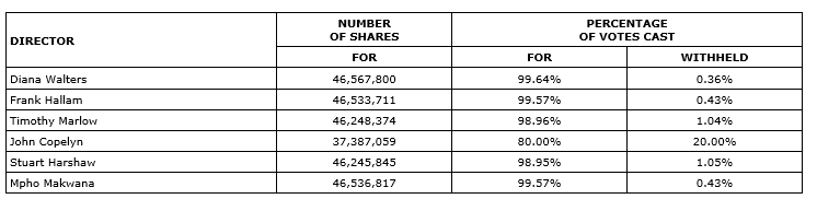 Shareholders also approved the reappointment of PricewaterhouseCoopers LLP as auditor of the company for the ensuing year, with a remuneration to be fixed by the directors. The resolution was approved by 99.40 per cent of votes cast.