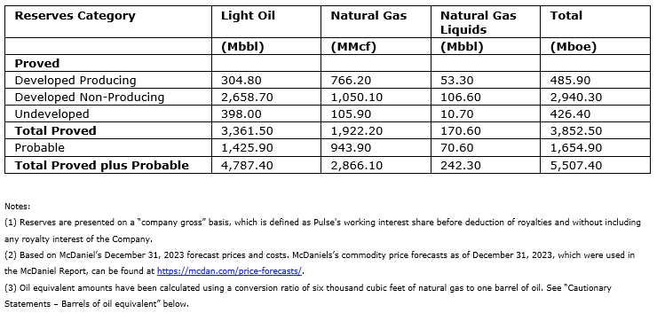 Pulse Oil also announces that an independent qualified reserves evaluator (as defined in National Instrument 51-101 (Standards of Disclosure for Oil and Gas Activities)) with the firm of McDaniel & Associates Consultants Ltd. has completed a reserves assessment, effective Dec. 31, 2023, on Pulse Oil's interests within the Bigoray and Queenstown core operating areas, which was prepared in accordance with the Canadian oil and gas evaluation handbook (as defined in NI 51-101), and resulted in a pretax net present value of $76.95-million for Pulse Oil's proven plus probable reserves and $41.73-million for Pulse Oil's proven reserves, using a 10-per-cent discount rate to Pulse Oil's net working interest. This represents an increase in the value of 2P reserves of 38.1 per cent and an increase in the value of 1P reserves of 71.7 per cent when compared with Dec. 31, 2022.