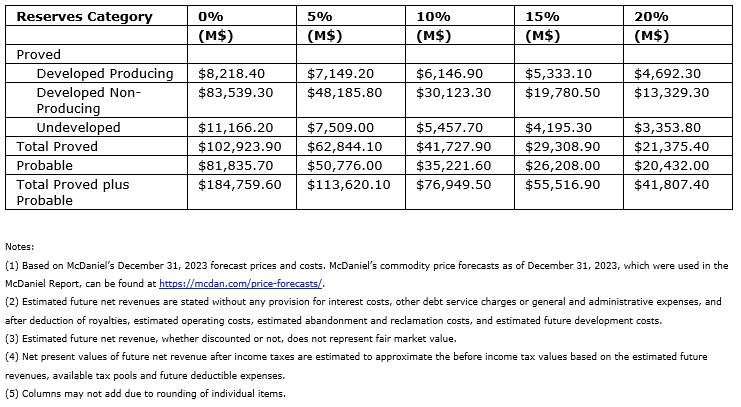The attached corporate reserves table is a summary of the company's estimated reserves as at Dec. 31, 2023, as evaluated in the McDaniel report.