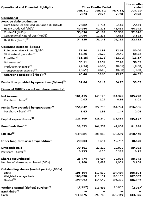 PAREX RESOURCES ANNOUNCES SECOND QUARTER RESULTS, DECLARATION OF Q3 2023 DIVIDEND, AND OPERATIONAL UPDATE