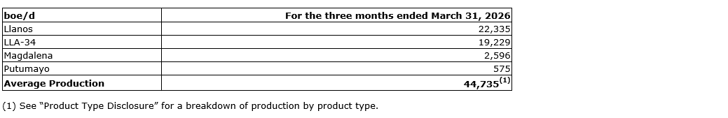 - With near-term production below the low end of the annual guidance range, the company expects output to increase in the second half of Q2 (second quarter) 2026, driven by remediations at LLA-32, continued scaling of Putumayo operations and the advancement of recent near-field exploration successes at LLA-111, supporting the company's FY (fiscal year) 2026 average production guidance of 45,000 to 49,000 boe/d.