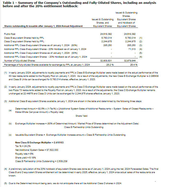 Additionally, $1,024,000 of system sales from Pizza 73 restaurants were added to the royalty pool ($1,714,000 from the four new Pizza 73 restaurants less $690,000 from the one permanently closed Pizza 73 restaurant). The $1,024,000 net, estimated Pizza 73 sales added to the royalty pool are applied against the $1,497,000 make-whole carryforward amount, reducing the estimated determined amount to nil for Jan. 1, 2024. The remaining make-whole carryover amount of $473,000 will be carried over, and a royalty will continue to be paid for subsequent years, until on an adjustment date, additional system sales of additional restaurants are sufficient to offset the Pizza 73 system sales attributable to all closed Pizza 73 restaurants. Additionally, since the estimated determined amount is negative it shall be deemed to be zero. Accordingly, the Class D exchange multiplier remained unchanged at 22.44976. The second adjustment to the Class D exchange multiplier will be adjusted to be effective Jan. 1, 2024, once the actual performance of the new restaurants is determined in early 2025.