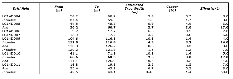 In 2014, Cyprium Mining Corp. drilled twelve holes in and around the historic workings. The program evaluated potentially higher-grade shallow copper-silver mineralization up to 150 m in depth (Cyprium Mining Management Discussion and Analysis, November 26, 2014). The program identified four closely spaced, parallel structures with widths between 0.25 m to 10 m in width. Grades ran from 0.2% to 12.4% copper and from 2 to 298 grams per tonne (g/t) silver (Table 1). Cyprium was seeking to put the Cristinas project into production at a small scale.