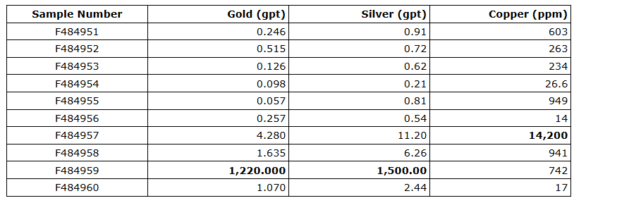 Rock samples were crushed to two millimetres and a 250-gram sub sample was pulverized with 85 per cent of the sample passing 75 micrometres (PREP-31). The subsample was analyzed using a combination of ALS Labs methods including Au-ICP21 for gold (30 g fire assay/AAA finish) and ME-MS61 for silver, base metals and other trace elements (four-acid digestion and trace level ICP-MS/ICP-AES analysis). For samples returning greater than 100 ppm silver or greater than 10,000 ppm lead or copper by method ME-MS61, samples were assayed by method ME-OG62 (ore grade four-acid digestion with ICP-AES analysis). For silver results greater than 1500 ppm Ag by ME-OG62, analysis was by method Ag-GRA21 (fire assay with gravimetric finish, 30 g sample). Sample F484959 was prepared and analyzed by metallic screen protocol, suitable for samples containing visible gold (preparation method SCR-21, PUL-32, analytical methods Au-SCR21, Au-GRA21, Au-AA25). For this sample, one kilogram of the prepared pulp was screened to 100 micrometres. The oversized fraction was analyzed in its entirety by fire assay with gravimetric finish (Au-GRA21). The undersized fraction was homogenized and two subsamples were analyzed by fire assay with AAS finish (Au-AA25). The total gold content for the sample was calculating from the results of the oversized and undersized fractions.
