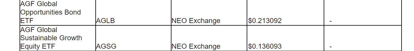 Unitholders of record of an AGF Investments ETF on Dec. 29, 2023, will receive: (i) the actual 2023 reinvested capital gains distributions payable in respect of that AGF Investments ETF on Dec. 29, 2023; and (ii) the actual December, 2023, cash distributions payable in respect of that AGF Investments ETF on Jan. 5, 2024. The actual taxable amounts for 2023, including the tax characteristics, will be reported in early 2024.