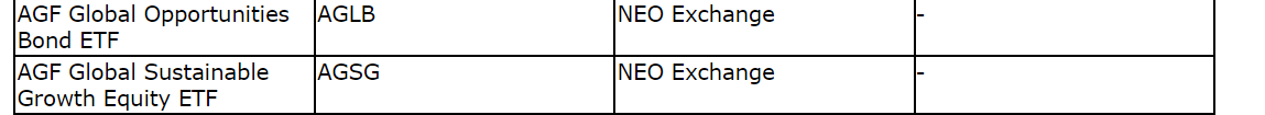AGF Management Ltd.'s AGF Investments Inc. has estimated annual 2023 reinvested distributions for the AGF Investments exchange-traded funds listed on the Toronto Stock Exchange or the NEO Exchange, as set out in an attached table. These estimated annual reinvested distributions generally represent realized capital gains within the AGF Investments ETFs and will not be paid in cash but will be reinvested and reported as taxable.